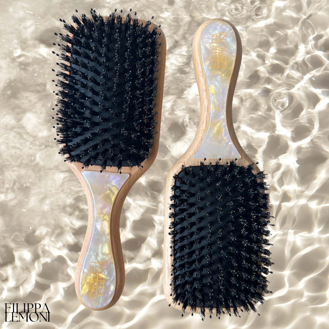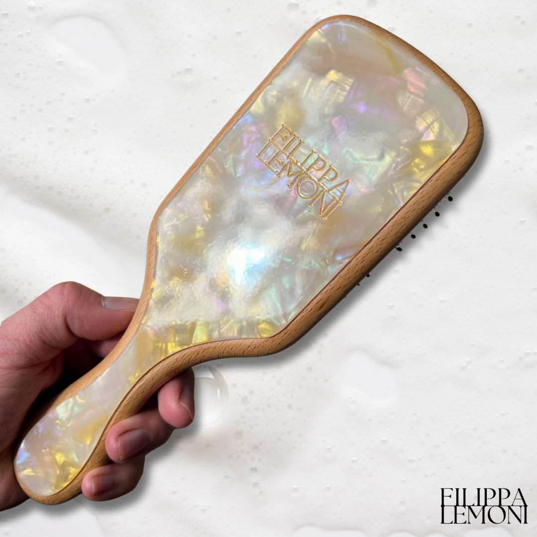 Eine wunderschöne goldene Haarbürste mit dem Filippa Lemoni-Logo auf beiden Seiten. Die Bürstenbasis ist flexibel und aus Gummi. Die Borsten sind weich und scharf. Sehr angenehm für die Kopfhaut. Die Bürste besteht aus Bambus und Acetat.